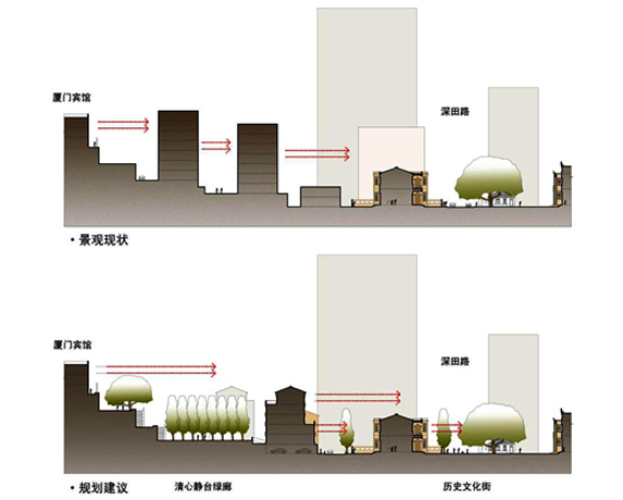 基地中央白鶴嶺高低的南側(cè)地區(qū),西臨中山公園,東接萬石山下的植物園,南抵廈門賓館高地,緊鄰城西旅游環(huán)的要徑。開發(fā)的策略將著重于運(yùn)用真實(shí)的歷史街區(qū)保護(hù),注入經(jīng)營性的休閑旅游商業(yè),并精心提升公共空間及歷史資源質(zhì)量,形成歷史街坊園區(qū)。