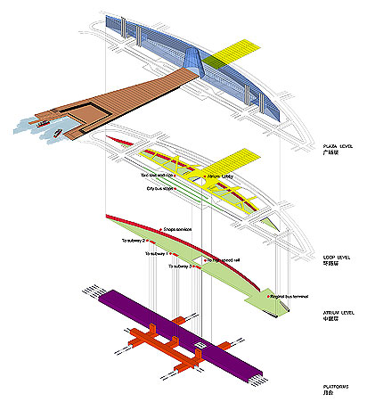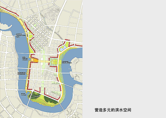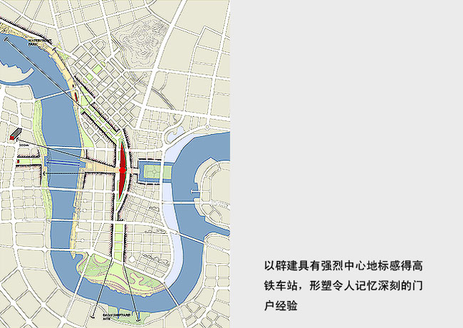 我們的方案利用辟建一個(gè)具有強(qiáng)烈中心地標(biāo)感的火車(chē)站,以形塑令人記憶深刻的門(mén)戶經(jīng)驗(yàn)。并以高鐵車(chē)站為中心,打造南北、東西兩條景觀軸線。劃設(shè)小街廓、密路網(wǎng)的適于步行的城市道路路網(wǎng),增強(qiáng)人際的交流互動(dòng)。CBD內(nèi)采用雙層的路網(wǎng)系統(tǒng)。辟建沿河的濱水步道和景觀平臺(tái),恢復(fù)基地東側(cè)濱河生態(tài)濕地,提升生態(tài)環(huán)境品質(zhì)。充分利用風(fēng)能、太陽(yáng)能、沼氣能等可再生、無(wú)污染的自然能源,營(yíng)建能源自足、零排放的生態(tài)社區(qū)。由濱水之處以緊湊的方式啟動(dòng)CBD,遵循一個(gè)開(kāi)放的生命的構(gòu)架有機(jī)地成長(zhǎng)。
