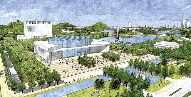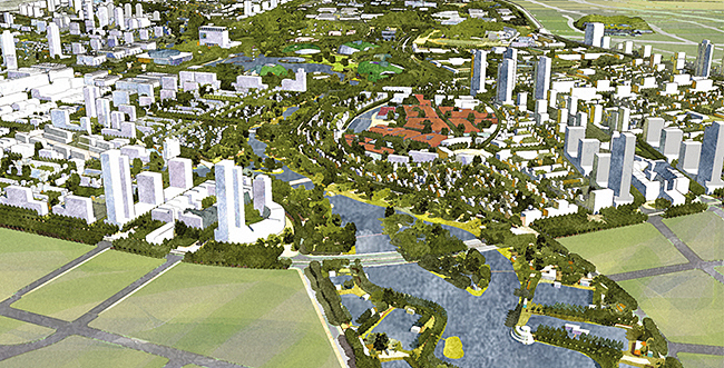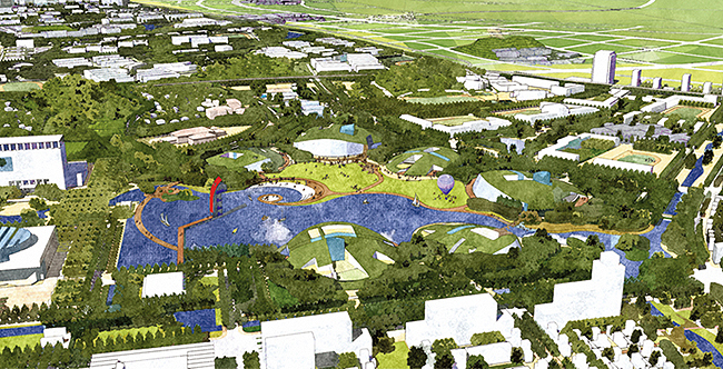 同時總體規(guī)劃上展現(xiàn)綠山頭、藍水道、正格網(wǎng)、連河廊、聚寶盆、活力環(huán)、魅力灣、綠街心、金包銀等規(guī)劃思路,在高效利用土地、提升開發(fā)效益、保有不同開發(fā)形態(tài)彈性之余,同時保護并展現(xiàn)基地既存地景特質(zhì)。