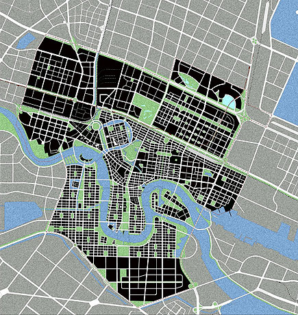 在開(kāi)放空間上,規(guī)劃中強(qiáng)調(diào)小街廓、密路網(wǎng)、窄街道,細(xì)致紋理的街道與街廓系統(tǒng)為新城奠定人性化城區(qū)的基調(diào)。方案推行新都市主義城市設(shè)計(jì)原則,不提倡分隔城市空間與人情交往的現(xiàn)行居住小區(qū)模式。