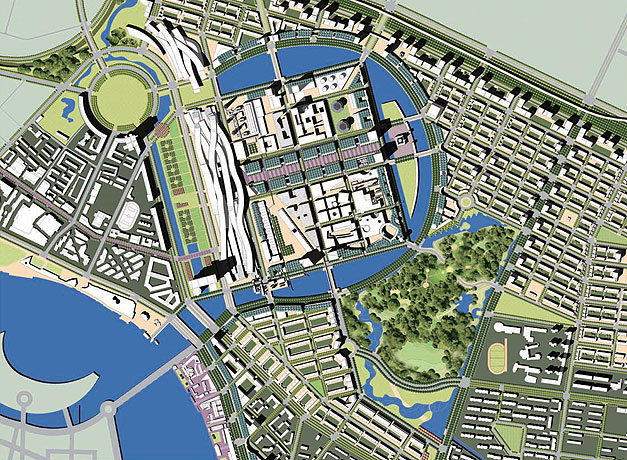 新城規(guī)模53平方公里,新城中心城市設(shè)計(jì)范圍10平方公里。項(xiàng)目的重點(diǎn)在于建立精明的城市成長(zhǎng)架構(gòu),建議消除鐵路及高架引道形成的發(fā)展阻絕,以密路網(wǎng)、窄街道、小街廓為城市肌理,由整合性的綠色基盤設(shè)施為支撐,以環(huán)狀低平板電車連結(jié)塘沽、泰達(dá)中心商業(yè)及商務(wù)區(qū)。致力發(fā)展大眾運(yùn)輸導(dǎo)向的土地使用型態(tài)。