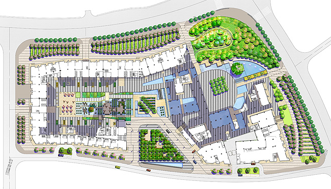 原建筑設計提出“架高地臺”的方式,有效處理了場地高程關系,并形成了一系列高低錯落的公共空間和“灰空間”。景觀設計順勢而為,利用涌泉、跌水、瀑布將各高程的開放空間串聯(lián)起來,構建出一幅具有內(nèi)在邏輯性的山水格局。水流動線與步行動線交織疊加在一起,目的是給在這座大型綜合體中穿梭的人們注入愉悅的空間體驗。