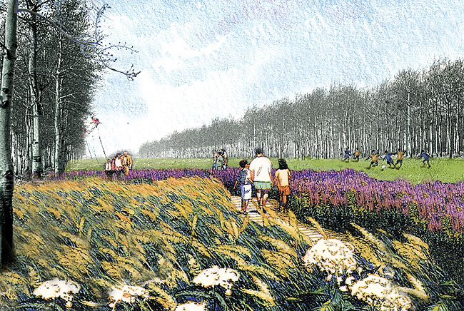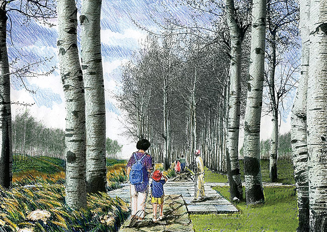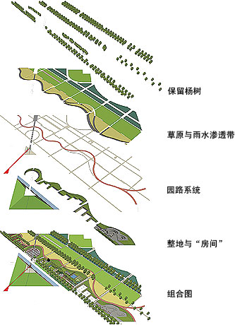 景觀設計遵循基地歷史紋脈,最大限度保留了原機場旁多重直挺的楊數(shù)列與原有機場跑道所形成的延伸寬廣的空間產(chǎn)生了強烈對比,營造出場所特殊的地方感,這種地方感成為了公園令人印象最為深刻的體驗。